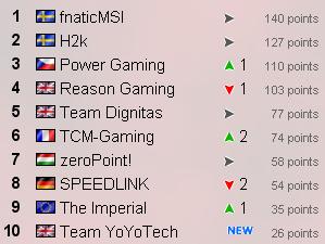 Представляем вашему вниманию рейтинг лучших CoD команд Европы за май 2010 года по версии cadred.org. Итак, первое место третий месяц подряд занимает шведская команда Швеция Fnatic. И это не удивительно, ведь парни уже на протяжении достаточно долгого времени показывают отличные результаты. Ну а на втором месте c 127-ю очками расположились Швеция H2k. Тройку лидеров замыкает чешская пятерка Чехия Power Gaming. Новичком майского рейтинга стала команда Великобритания Team YoYoTech, в активе которой 26 очков. Посмотрим, сможет ли британская команда закрепить свою позицию в следующем месяце.